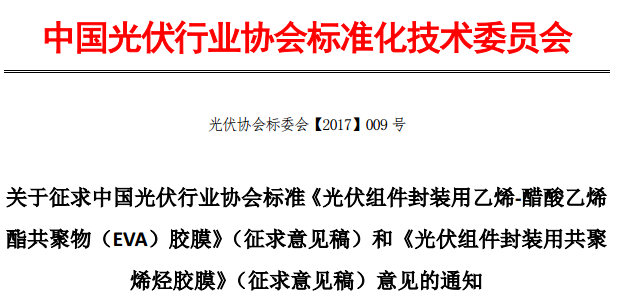 各有關(guān)單位: 根據(jù)中國光伏行業(yè)協(xié)會《關(guān)于印發(fā)2016年第一批光伏協(xié)會標準制修訂計劃的通知》(中光伏協(xié)【2016】8號),光伏協(xié)會標準《光伏組件封裝用乙烯-醋酸乙烯酯共聚物(EVA)膠膜》(計劃號2016005-CPIA)和《光伏組件封裝用共聚烯烴膠膜》(計劃號2016007-CPIA)由中國光伏行業(yè)協(xié)會標準化技術(shù)委員會(下稱“光伏協(xié)會標委會”)歸口管理,杭州福斯特光伏材料股份有限公司等牽頭制定。