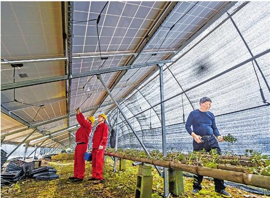 “農(nóng)光互補(bǔ)”指種植業(yè)與光伏發(fā)電相結(jié)合,在地面上方架設(shè)光伏板陣列,光伏板下方大棚種植喜陰經(jīng)濟(jì)作物,形成“上可發(fā)電、下可種植”的現(xiàn)代農(nóng)業(yè)新模式,助力農(nóng)戶增收。自2015年底并網(wǎng)發(fā)電以來,該種植示范區(qū)售電收入已達(dá)100多萬元。新華社記者 徐昱 攝