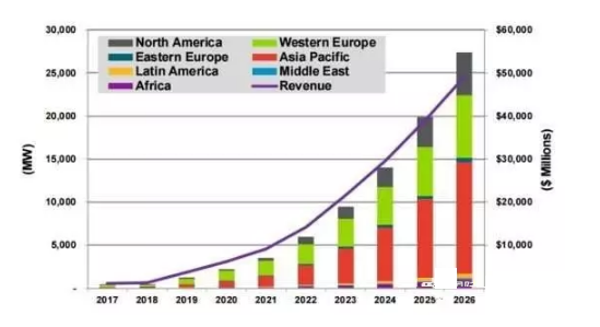 根據(jù)Navigant Research最新發(fā)布的研究報(bào)告,由于獨(dú)立的分布式光伏系統(tǒng)的價(jià)值有限,“分布式光伏+儲(chǔ)能”(distributed solar PV plus energy storage,簡稱DSES)在未來10年內(nèi)將成為全球光伏市場的新熱點(diǎn),主要應(yīng)用于居民住宅、商業(yè)建筑和邊遠(yuǎn)地區(qū)的離網(wǎng)供電。預(yù)計(jì)到2026年DSES總裝機(jī)可達(dá)27.4吉瓦,市場規(guī)模達(dá)到491億美元;其中亞太地區(qū)總裝機(jī)約為12.9吉瓦,市場規(guī)模為231億美元。