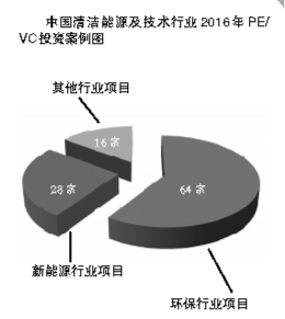 中國清潔能源及技術行業(yè)在2016年共發(fā)生PE/VC投資案例108宗,披露投資總額達13.65億美元。其中環(huán)保行業(yè)項目最多,達到64宗;新能源行業(yè)項目28宗,但投資金額高達8.34億美元。