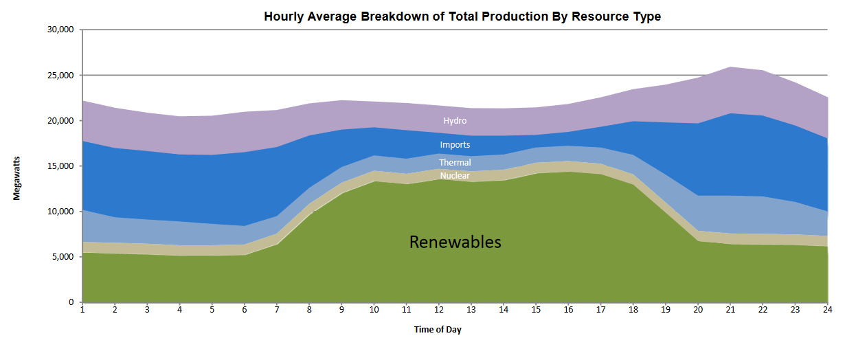 若以能量來(lái)源區(qū)分,水力、熱能與核能發(fā)電在一天之中的變化不大,再生能源總發(fā)電量則因太陽(yáng)能的緣故而在白天時(shí)段明顯增加。