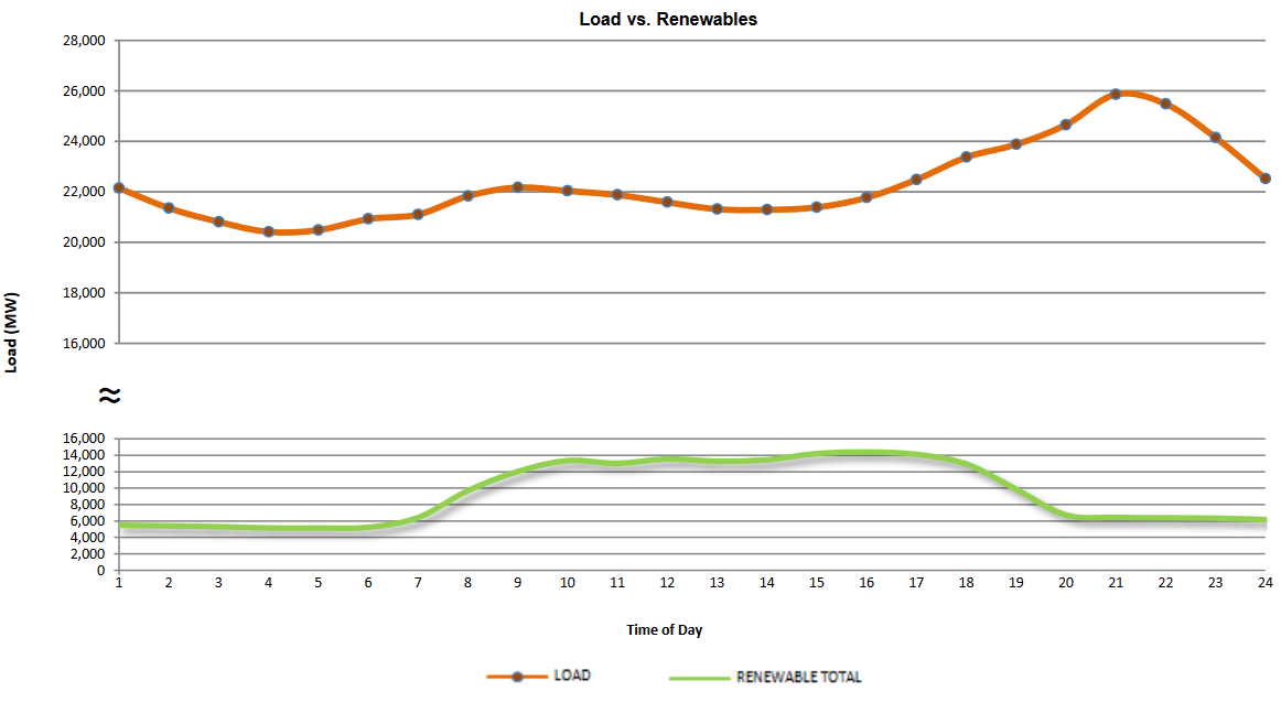 ▲ 總用電量與再生能源總發(fā)電量時(shí)段分布。(Source:Renewables Watch)
