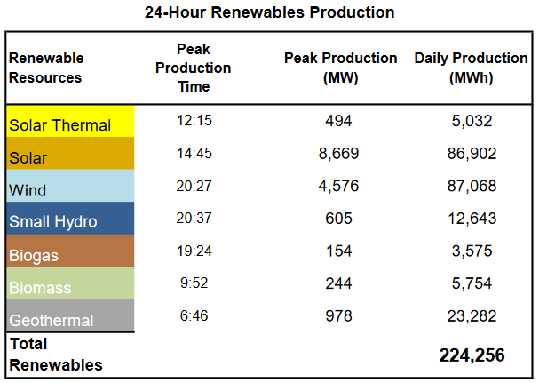 ▲ 各種再生能源的峰值時(shí)段、峰值發(fā)電量、日發(fā)電量。(Source:Renewables Watch)