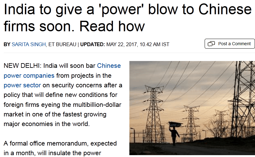 印度《經(jīng)濟時報》5月22日報道稱,出于對“安全問題”的考慮,印度很快將出臺一項政策限制中國公司在印度電力領(lǐng)域的項目開展投資。據(jù)稱,該政策將給那些想從印度價值數(shù)十億美元的市場中獲利的外國公司制定新條件。
