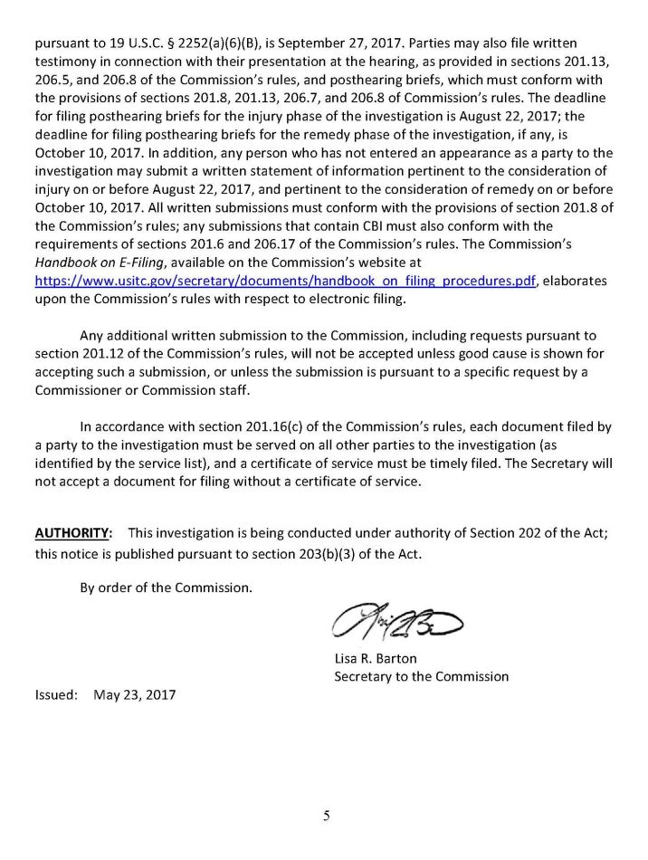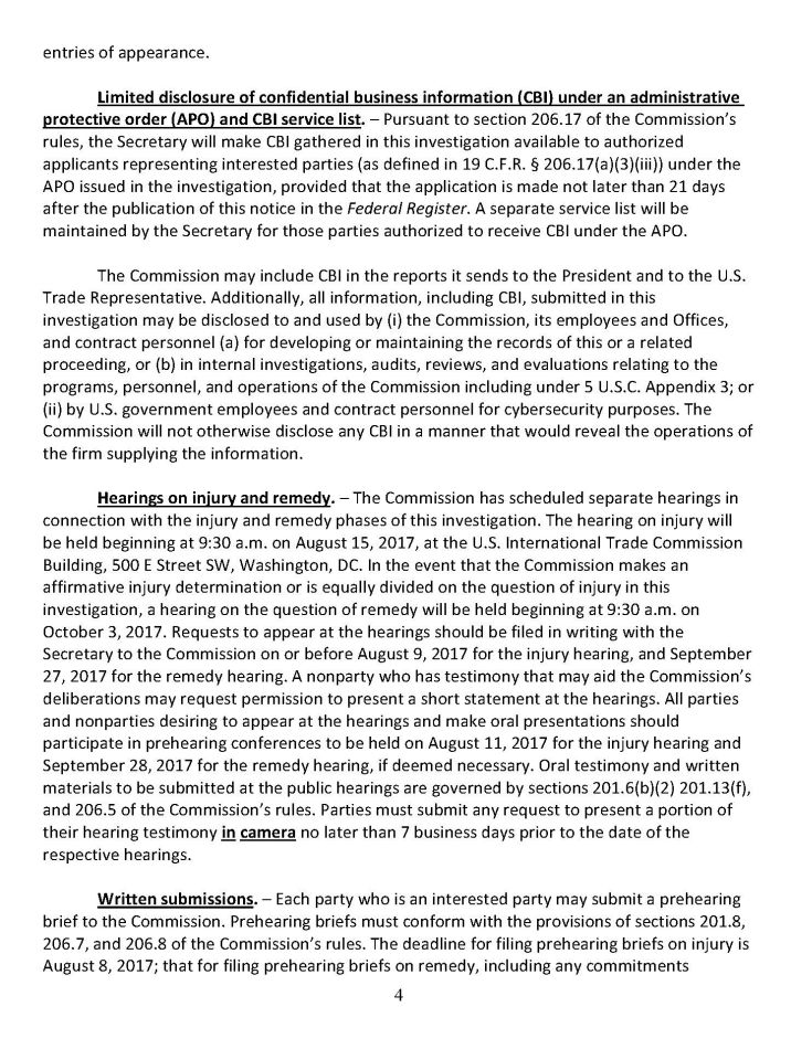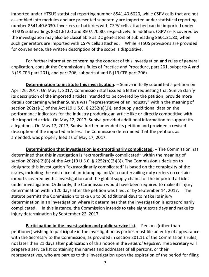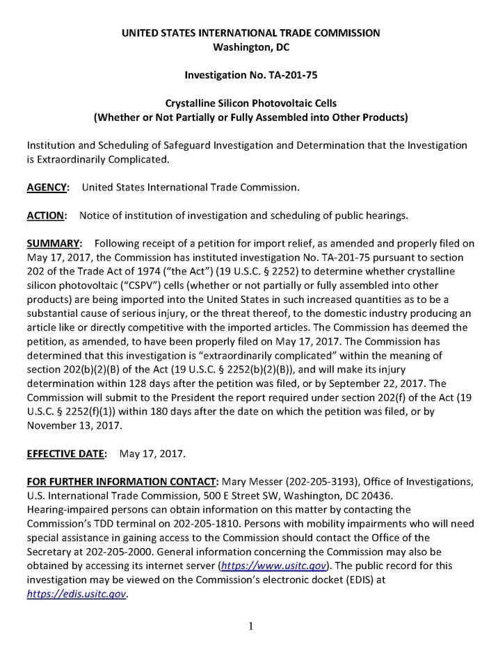 美國(guó)東部時(shí)間2017年5月23日,美國(guó)國(guó)際貿(mào)易委員會(huì)發(fā)布公告,稱應(yīng)國(guó)內(nèi)光伏企業(yè)Suniva申請(qǐng),對(duì)全球光伏電池及組件發(fā)起保障措施調(diào)查(“201”調(diào)查)。公告稱,由于案情復(fù)雜,將延期至30天至9月22日作出損害認(rèn)定,并在11月22日前向總統(tǒng)提交調(diào)查報(bào)告。