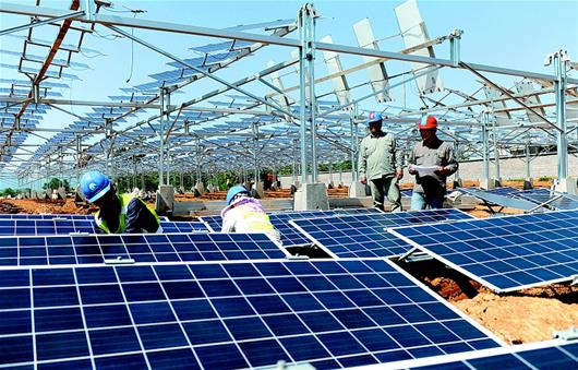 5月24日,湖北黃石供電公司工作人員在陽新浮屠鎮(zhèn)農(nóng)光互補(bǔ)光伏電站建設(shè)現(xiàn)場查看光伏組件的安裝進(jìn)度。該項(xiàng)目分三期建成,一期規(guī)劃總裝機(jī)容量為30MW,計(jì)劃于下月建成投入使用。項(xiàng)目建成后,將極大緩解周邊群眾用電難,幫助農(nóng)民增收創(chuàng)富。(視界網(wǎng) 劉加良攝)