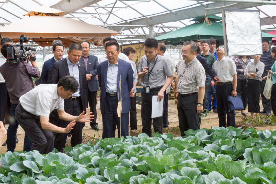 5月24日上午,陳昌智副委員長在高紀凡董事長的陪同下首先前往常州市孟河鎮(zhèn)參觀天合光能孟河農(nóng)光互補項目。在光伏農(nóng)業(yè)大棚內(nèi),陳昌智和調(diào)研組成員站在田邊饒有興趣地向工作人員了解光伏大棚的建造成本、并網(wǎng)發(fā)電、以及運營模式等情況。
