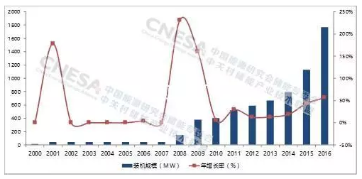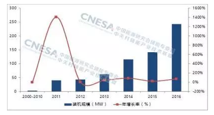中國電化學儲能市場累計裝機規(guī)模(2000-2016)