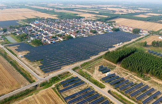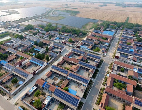 6月17日,俯瞰踹鼓張村1375KW光伏發(fā)電項(xiàng)目一角。日前,位于山東北部的高青縣常家鎮(zhèn)踹鼓張村的1375KW光伏扶貧發(fā)電項(xiàng)目正式并網(wǎng)投入使用。2017年初,踹鼓張村開(kāi)始為村里128戶(hù)村民安裝分布式光伏發(fā)電站,平均每戶(hù)可以鋪設(shè)10KW屋頂光伏電站,每戶(hù)每年可增加收入12740元。