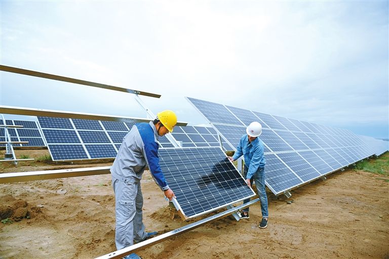 6月22日,位于烏蘭察布市四子王旗紅格爾蘇木瀚烏拉嘎查的內(nèi)蒙古準(zhǔn)興新能源投資有限公司光伏發(fā)電項(xiàng)目現(xiàn)場(chǎng),工人在搶時(shí)間安裝光伏組件。據(jù)悉,該項(xiàng)目將建設(shè)光伏總?cè)萘繛?萬(wàn)千瓦的發(fā)電廠,共投資4.2億元,分3期完成。其中,一期1萬(wàn)千瓦光伏發(fā)電項(xiàng)目預(yù)計(jì)6月30日前并網(wǎng)發(fā)電,屆時(shí)年發(fā)電量將達(dá)到1670萬(wàn)千瓦。