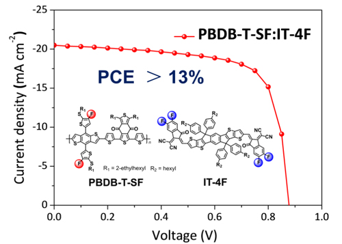 近期,在中國科學(xué)院和國家自然科學(xué)基金委的支持下,中科院化學(xué)研究所高分子物理與化學(xué)實(shí)驗(yàn)室研究員侯劍輝課題組研究人員同時(shí)對OSCs中給、受體材料進(jìn)行了優(yōu)化,并基于此制備了OSCs,實(shí)現(xiàn)了超過13%的PCE,該效率是目前OSCs領(lǐng)域報(bào)道的世界最高結(jié)果(J. Am. Chem. Soc. 2017, 139, 7148–7151)。他們將氟原子分別引入到聚合物給體PBDB-T和非富勒烯受體ITIC上,設(shè)計(jì)合成了新型的給、受體PBDB-T-SF和IT-4F(如下圖所示)。新型給、受體材料的吸收性能比原來有明顯的提高,使得相應(yīng)OSCs的短路電流密度有了大幅的提升,獲得了13%的PCE,并得到了中國計(jì)量科學(xué)研究院的認(rèn)證。此外,該OSCs可以在較寬的膜厚范圍內(nèi)和較長時(shí)間的存儲(chǔ)中保持優(yōu)異的性能,這對OSCs的實(shí)際應(yīng)用具有重要的意義。