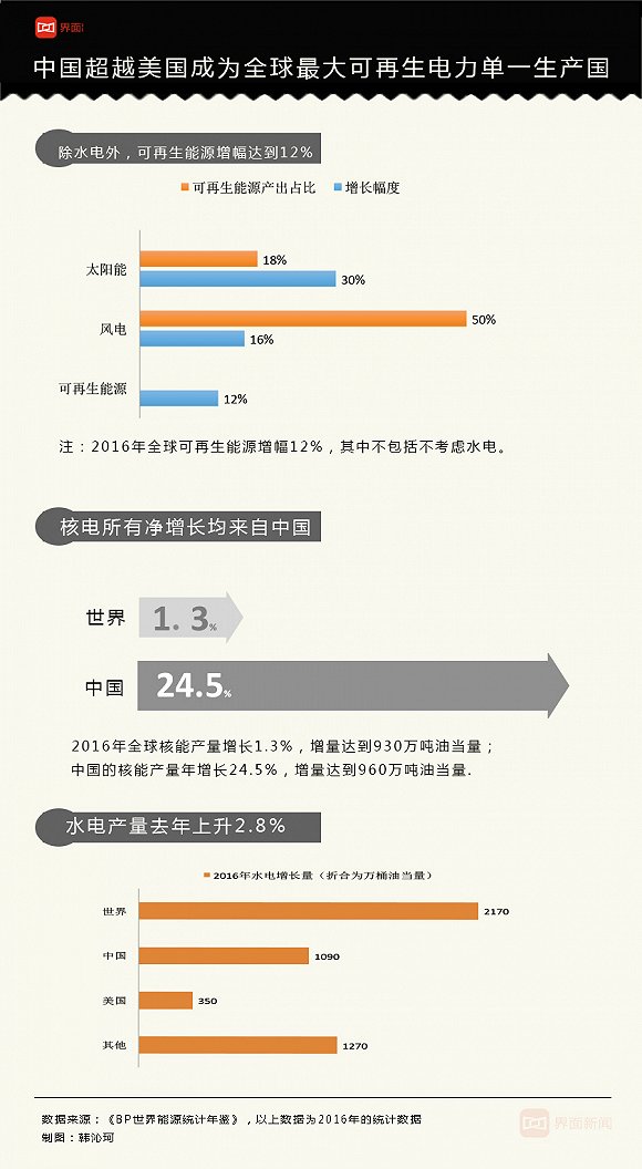 2016年,可再生能源創(chuàng)有史以來最大的年增加量,也是所有能源中增長最快的部分。但在全球一次能源中的占比僅為4%?稍偕茉丛鲩L量的約1/3來自太陽能的增長量。同時,亞太地區(qū)超越歐洲和歐亞大陸成為可再生電力最大的生產(chǎn)地區(qū)。
