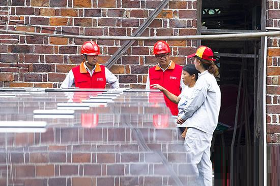 國網(wǎng)株洲供電公司的共產(chǎn)黨員服務(wù)隊(duì)正在貧困戶鄧曉英家屋頂,詢