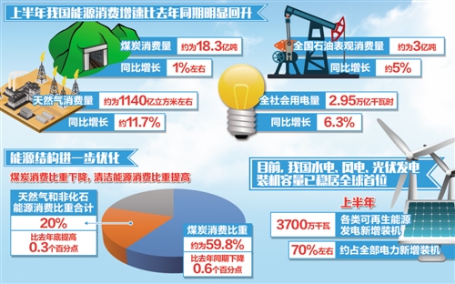 與此同時,能源結(jié)構(gòu)進一步優(yōu)化。煤炭消費比重下降,上半年,煤炭消費比重大約為59.8%,比去年同期下降0.6個百分點;清潔能源消費比重提高,天然氣和非化石能源消費比重合計為20%,比去年底提高0.3個百分點。