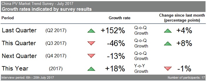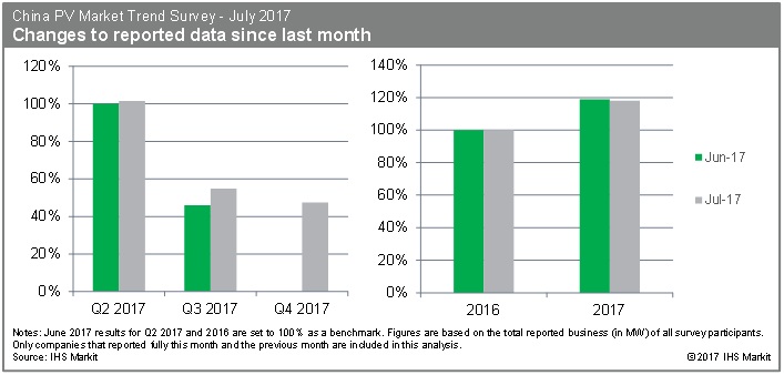 IHS Markit最新的七月版《中國(guó)光伏市場(chǎng)趨勢(shì)調(diào)研》報(bào)告結(jié)果日前出爐,該報(bào)告顯示, 七月調(diào)研結(jié)果發(fā)現(xiàn),二季度出貨/裝機(jī)量相比上月調(diào)研結(jié)果更有4%提升,季度環(huán)比增量達(dá)152%; 大多數(shù)調(diào)研參與者表示三季度出貨量/裝機(jī)量會(huì)顯著下降。然而,總體來(lái)講,三季度的預(yù)期較上月調(diào)研結(jié)果提高了8個(gè)百分點(diǎn),相比二季
