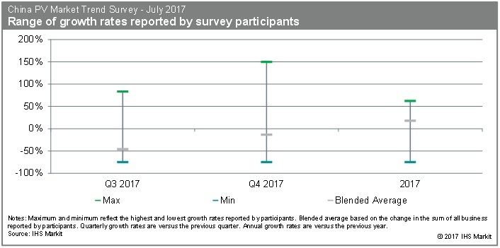 IHS Markit最新的七月版《中國(guó)光伏市場(chǎng)趨勢(shì)調(diào)研》報(bào)告結(jié)果日前出爐,該報(bào)告顯示, 七月調(diào)研結(jié)果發(fā)現(xiàn),二季度出貨/裝機(jī)量相比上月調(diào)研結(jié)果更有4%提升,季度環(huán)比增量達(dá)152%; 大多數(shù)調(diào)研參與者表示三季度出貨量/裝機(jī)量會(huì)顯著下降。然而,總體來(lái)講,三季度的預(yù)期較上月調(diào)研結(jié)果提高了8個(gè)百分點(diǎn),相比二季度,三季度降幅為46%;調(diào)研結(jié)果顯示,因?yàn)槲磥?lái)政策走向不明,四季度走勢(shì)偏弱。平均來(lái)看,本年度最后一個(gè)季度環(huán)比降幅達(dá)13%。