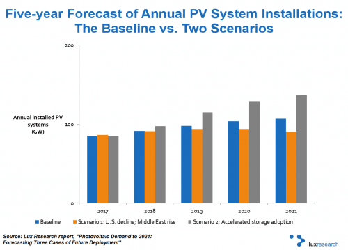 美國勒克斯研究公司Lux Research發(fā)布報告稱,2016年,全球新增太陽能光伏裝機容量達(dá)到75吉瓦,同比增長49%。預(yù)計到2021年,全球光伏裝機容量累計近800吉瓦,年復(fù)合增率約為6%。