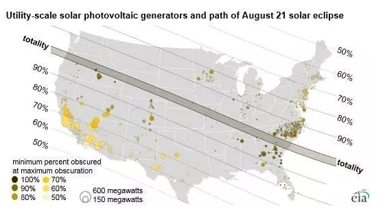 2017年8月21日星期一,一次持續(xù)2分40秒日全食將會(huì)在橫穿美國(guó)大陸的一條帶狀地區(qū)內(nèi)可見,同時(shí)還是美國(guó)唯一一個(gè)能觀測(cè)到此次日全食的國(guó)家。美國(guó)上一次橫貫整個(gè)本土可見的日全食發(fā)生在1918年6月18日。但是這一次日全食的影響與上一次有所不同,因?yàn)楝F(xiàn)在美國(guó)有1900座大型地面太陽(yáng)能光伏電站。