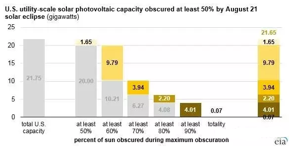 根據(jù)美國(guó)能源信息署的預(yù)測(cè),在日食持續(xù)2分40秒這段短暫的時(shí)間內(nèi),受到日食不同程度影響美國(guó)光伏裝機(jī)將達(dá)到21.75吉瓦,其中處于日全食帶狀地區(qū)的70兆瓦的裝機(jī)將在日全食持續(xù)過(guò)程中完全失去發(fā)電能力;而3.05吉瓦的光伏電站將失去90%的發(fā)電能力,2.20吉瓦的光伏電站將失去80%的發(fā)電能力,3.94吉瓦的光伏電站將失去70%的發(fā)電能力,9.79吉瓦失去60%的發(fā)電能力。雖然有21.75吉瓦的裝機(jī)將在很短的時(shí)間內(nèi)受到波及,但美國(guó)光伏發(fā)電比例很小,預(yù)計(jì)美國(guó)電網(wǎng)的安全穩(wěn)定運(yùn)行將不會(huì)受到明顯影響。