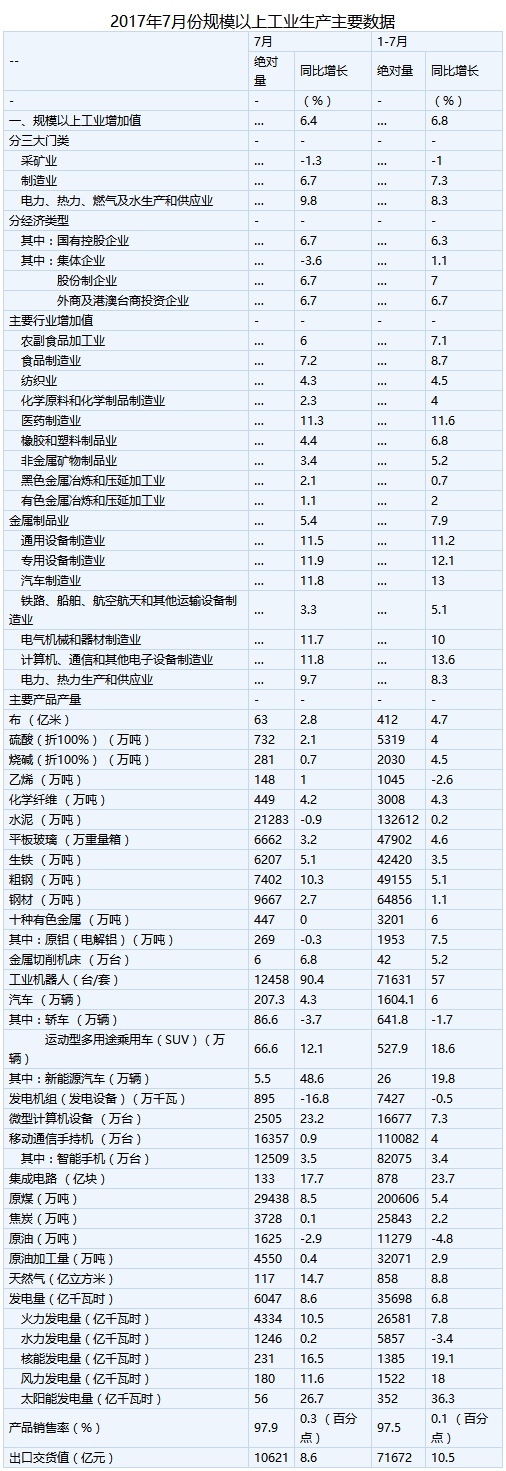 據(jù)國家統(tǒng)計局最新數(shù)據(jù)顯示,2017年7月規(guī)模以上工業(yè)增加值同比實際增長6.4%(以下增加值增速均為扣除價格因素的實際增長率)。1-7月份,規(guī)模以上工業(yè)增加值同比增長6.8%。其中,2017年7月份我國太陽能發(fā)電量56億千瓦時,同比增長26.7%。1-7月份,我國太陽能發(fā)電量共計352億千瓦時,同比增長36.3%。