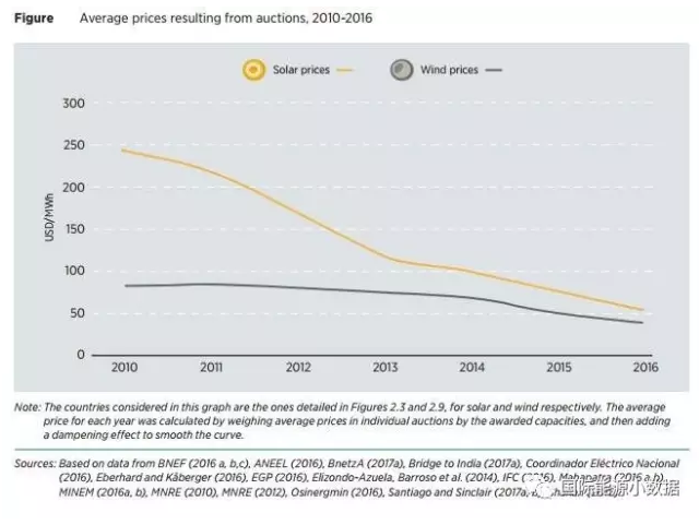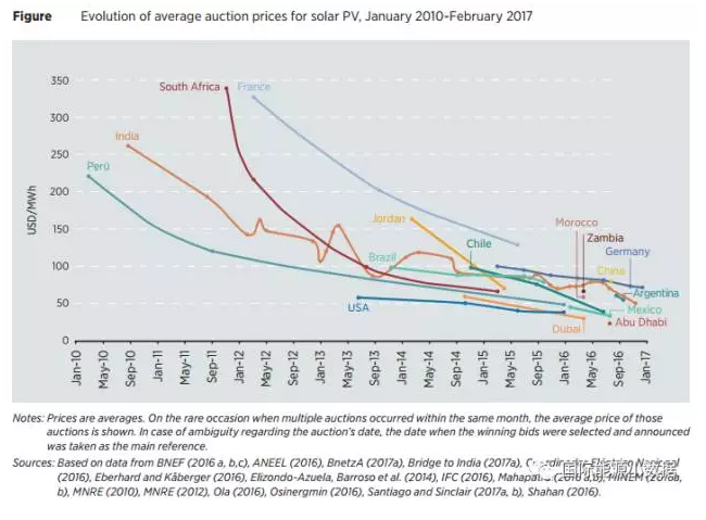 根據(jù)國際可再生能源署最新發(fā)布的《可再生能源競(jìng)價(jià)分析報(bào)告》,到2016年中已經(jīng)至少有67個(gè)國家以競(jìng)價(jià)方式確定可再生能源項(xiàng)目,而2010年時(shí)只有10個(gè)國家實(shí)行可再生能源項(xiàng)目競(jìng)價(jià)。相比固定的標(biāo)桿價(jià)格,可再生能源競(jìng)價(jià)有效地降低了可再生能源上網(wǎng)的價(jià)格。2010年,風(fēng)電合同平均價(jià)格為80美元/兆瓦時(shí)、光伏為250美元/兆瓦時(shí);而2016年風(fēng)電平均合同價(jià)下降37.5%,為40美元/兆瓦時(shí),光伏下降幅度更達(dá)到80%,為50美元/兆瓦時(shí)(相當(dāng)于人民幣0.33元/千瓦時(shí))。