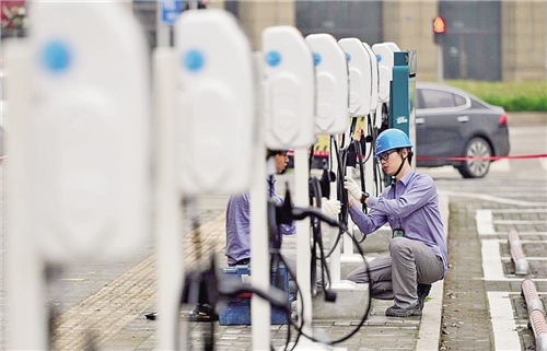 海寧加快建設(shè)充電樁,助推綠色出行。圖為工作人員檢查充電樁。 王軼辰攝