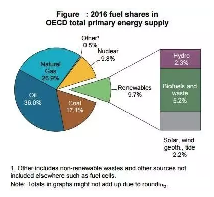 經(jīng)濟(jì)合作與發(fā)展組織(OECD)號(hào)稱(chēng)是“富人俱樂(lè)部”,因?yàn)?5個(gè)成員國(guó)都屬于發(fā)達(dá)國(guó)家。2016年經(jīng)合組織國(guó)家的一次能源消費(fèi)為5.12億噸標(biāo)準(zhǔn)油,其中石油占比最高達(dá)到36%,其他能源依次是:天然氣(26.9%)、煤炭(17.1%)、核能(9.8%)、可再生能源(9.7%)。也就是說(shuō),經(jīng)合組織國(guó)家的化石能源消費(fèi)