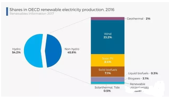 如果單看2016年可再生能源發(fā)電量的構(gòu)成,水電占54.2%,其次是風(fēng)電(23.2%)、太陽(yáng)能光伏(8.4%)、固體生物燃料(7.1%)、沼氣發(fā)電(3.1%)、地?zé)幔?%)、市政垃圾(1.3%)、其他(0.8%)。