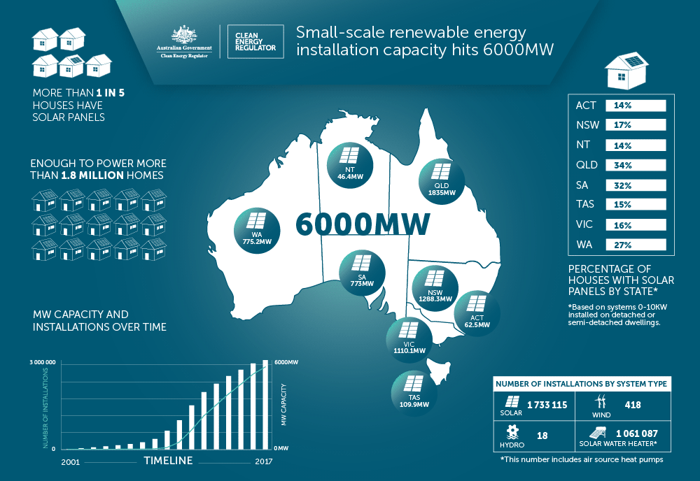 澳洲聯(lián)邦政府清潔能源監(jiān)管局(CER)近日公布,目前澳洲小型可再生能源項(xiàng)目裝機(jī)量已達(dá)到6000兆瓦,可為180萬戶家庭提供足夠的電力。CER表示,小型可再生能源項(xiàng)目是指發(fā)電量不超過100千瓦或不超過家庭項(xiàng)目平均裝機(jī)量20倍的發(fā)電項(xiàng)目,主要方式是家庭和其他業(yè)主在屋頂安裝的屋頂太陽能電池板、太陽能熱水器、風(fēng)力和水力
