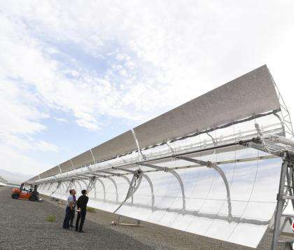 陳國平表示,高溫熔鹽槽式與塔式、菲涅爾式有很大的不同。它是通過槽式玻璃面反射聚焦,聚焦率可以達到96%以上,比菲尼爾、塔式,集熱性能更佳更好。遇到惡劣天氣,系統(tǒng)還會調(diào)控旋轉(zhuǎn),進行自我保護。