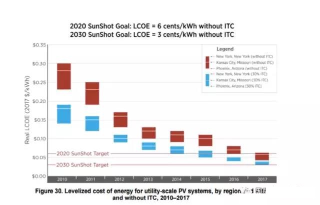 這樣,美國公共事業(yè)級(jí)光伏電站已經(jīng)基本實(shí)現(xiàn)能源部2011年為2020年設(shè)定的成本下行目標(biāo)(Sunshot Goal):度電平準(zhǔn)成本6美分/千瓦時(shí)、系統(tǒng)投資成本1美元/瓦。