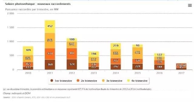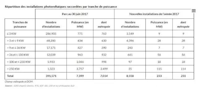 根據(jù)法國政府可持續(xù)發(fā)展部公布的數(shù)據(jù),到2017年6月底法國光伏總裝機達(dá)到7399兆瓦,發(fā)電量占法國電量消費的1.7%。2017年6月底法國共有391571套光伏系統(tǒng)投運,其中1323套系統(tǒng)(3757兆瓦)的單機容量超過250千瓦,其余均為小型光伏系統(tǒng)(單機低于3千瓦的光伏系統(tǒng)有286905套。)