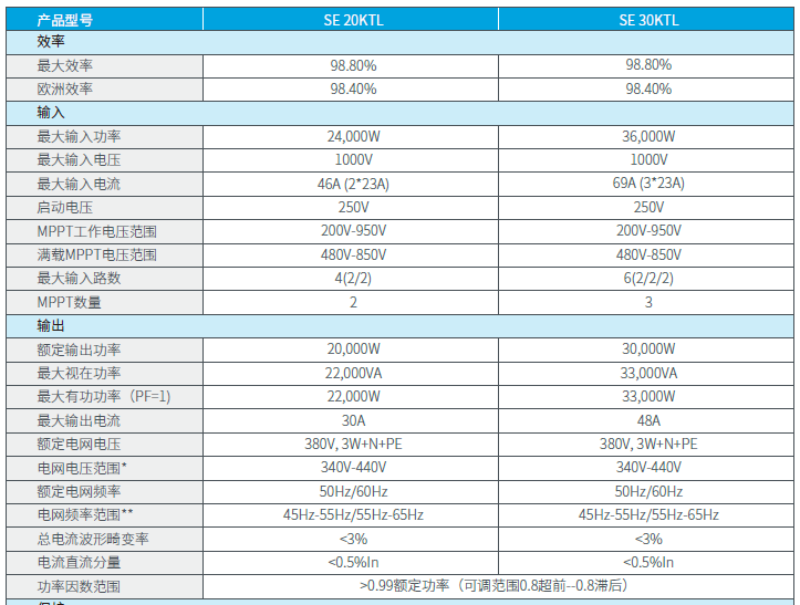 盛能杰SE-30KTL逆變器為三路MPPT,共六路PV輸入。具體參數(shù)如下: