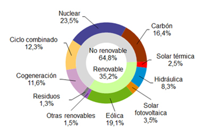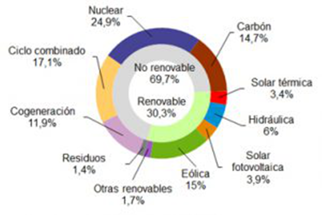 數(shù)據(jù)顯示,西班牙9月份可再生能源發(fā)電量的占比達30.3%。其中,風力發(fā)電量達2,764GWh,較去年同期增長7%,占當月總發(fā)電量的15%;核電、聯(lián)合循環(huán)、煤電、熱電聯(lián)產(chǎn)、水電、光伏發(fā)電量占比情況分別為24.9%、17.1%、14.7%、11.9%、6%與3.9%(見下圖),當月共計54.9%的發(fā)電量均來自不排放二氧化碳的發(fā)電技術(shù)。