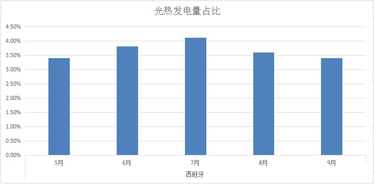 根據(jù)最新數(shù)據(jù),西班牙9月份光熱發(fā)電量占該國當月總發(fā)電量的3.4%,與本年5月份持平,但較6、7、8月份有所下滑。