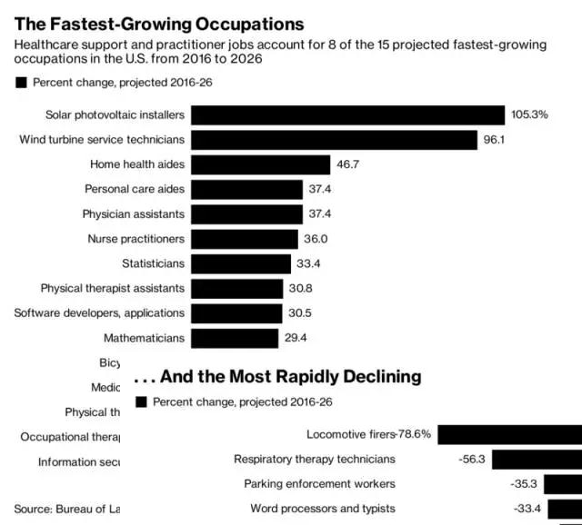 據(jù)美國勞工部預(yù)測,2016-2026年間美國增長最快的工作崗位是光伏系統(tǒng)安裝工(+105%)。2016年光伏系統(tǒng)安裝工的工資中位線為39,240美元,預(yù)計2026年工資水平加倍。除了光伏安裝以外,其次是風(fēng)機(jī)技工也將大幅增長(+96%)。此外家庭健康護(hù)工、醫(yī)生助理、護(hù)士等崗位也有30%到46%的成長空間。值得注意的是,