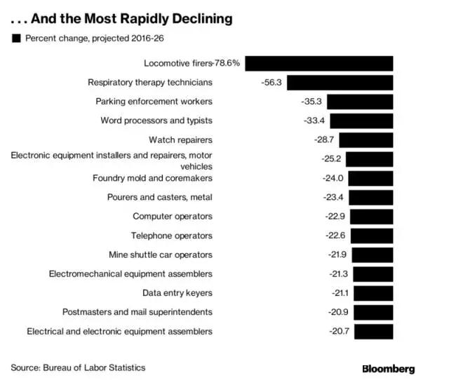 2016-2026年下述職業(yè)的工作機(jī)會將面臨縮水:火車操作工(-79%)、呼吸療法技術(shù)員(-56%)、停車場看護(hù)員(-35%)、打字員(-33%)、修表工人(-29%)。