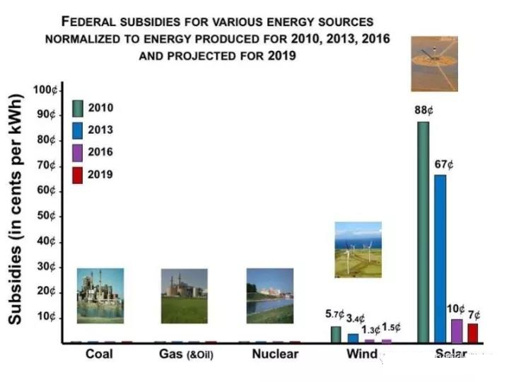 根據(jù)美國能源信息署與得克薩斯大學(xué)的數(shù)據(jù),2010年至2013年,美國聯(lián)邦政府對于太陽能光伏發(fā)電的補貼從88美分/千瓦時降至67美分/千瓦時;2016年再降至10美分/千瓦時。2010年至2013年,對風(fēng)電的補貼從5.7美分/千瓦時降至3.4美分/千瓦時;2016年降至1.3美分/千瓦時。預(yù)計到2019年光伏補貼為7美分/千瓦時,而風(fēng)電補貼略