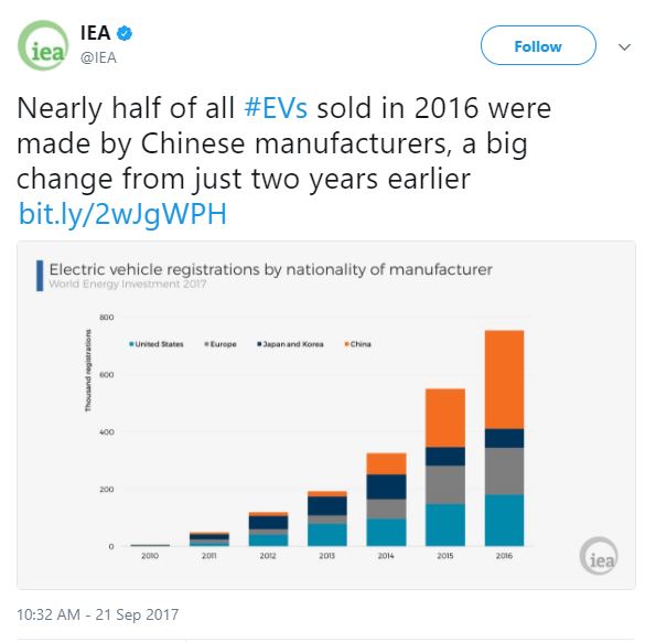 在電動(dòng)汽車方面,中國(guó)已經(jīng)做到全球行業(yè)發(fā)展的領(lǐng)跑者。2016年中國(guó)銷售電動(dòng)汽車33.6萬(wàn)輛,幾乎是全球銷售總量的一半,中國(guó)新能源汽車的保有量也在全球占比過(guò)半。