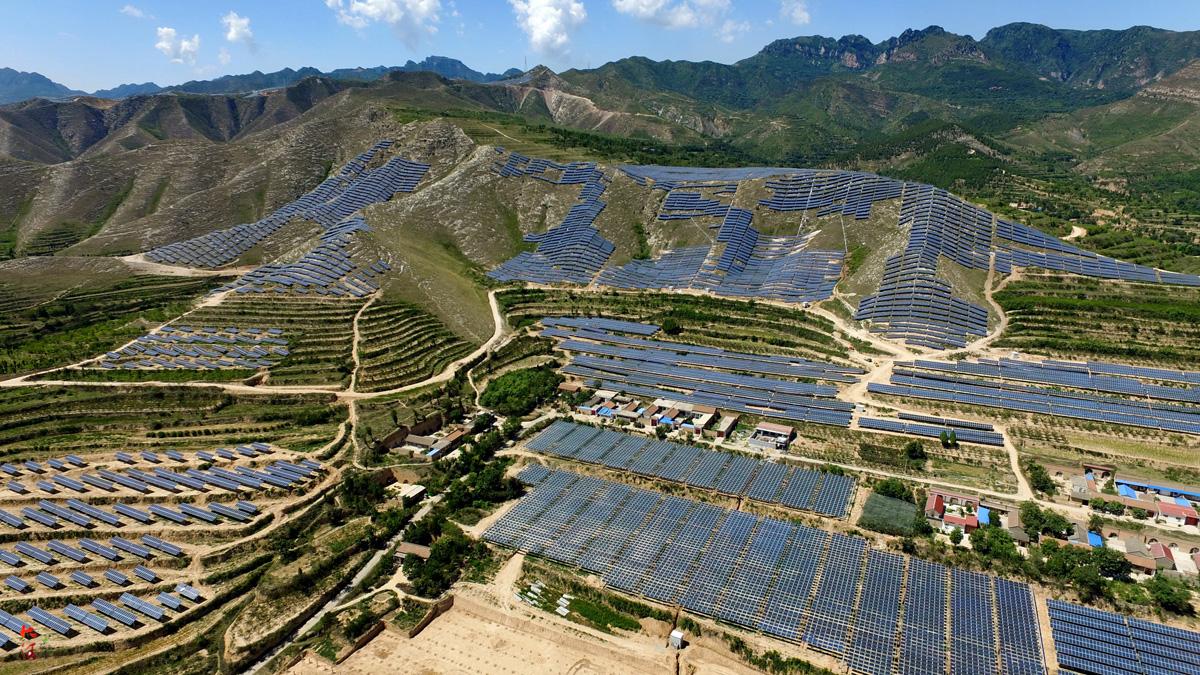 藍色的光伏發(fā)電板鋪滿了山坡。圖為芮城協(xié)鑫光伏發(fā)電場址全景。 車大偉攝