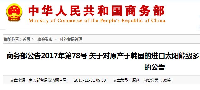 2014年1月20日,商務(wù)部發(fā)布年度第5號(hào)公告,決定自2014年1月20日起,對(duì)原產(chǎn)于美國(guó)和韓國(guó)的進(jìn)口太陽(yáng)能級(jí)多晶硅征收反傾銷稅。