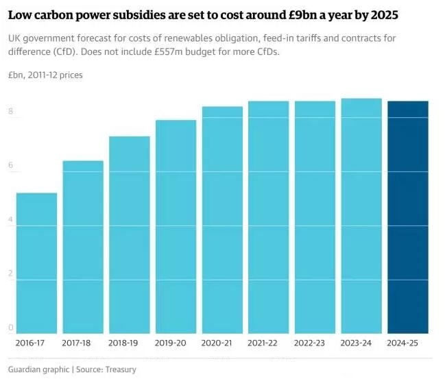 英國(guó)財(cái)政部在日前公布財(cái)政預(yù)算文件中披露,“為了維護(hù)消費(fèi)者的利益”,在2025年以后將停止對(duì)于新建的可再生能源項(xiàng)目的各種財(cái)務(wù)補(bǔ)貼,包括可再生能源強(qiáng)制配額、固定上網(wǎng)電價(jià)、差價(jià)合同等。當(dāng)然,這一決定不會(huì)影響2025年以前的可再生能源項(xiàng)目的持續(xù)補(bǔ)貼。英國(guó)財(cái)政部估算,到2025年對(duì)已經(jīng)投入運(yùn)行的項(xiàng)目補(bǔ)貼將達(dá)到每年90億英鎊。