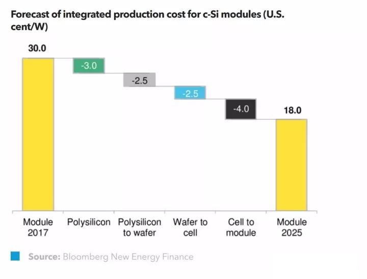 目前,全球光伏發(fā)電量占總發(fā)電量的比例少于2%,基于光伏技術(shù)成本的不斷下降,彭博新能源財(cái)經(jīng)預(yù)計(jì)在未來(lái)23年里將有4000GW新增裝機(jī)容量,且全球光伏發(fā)電量將于2040年增長(zhǎng)至17%。