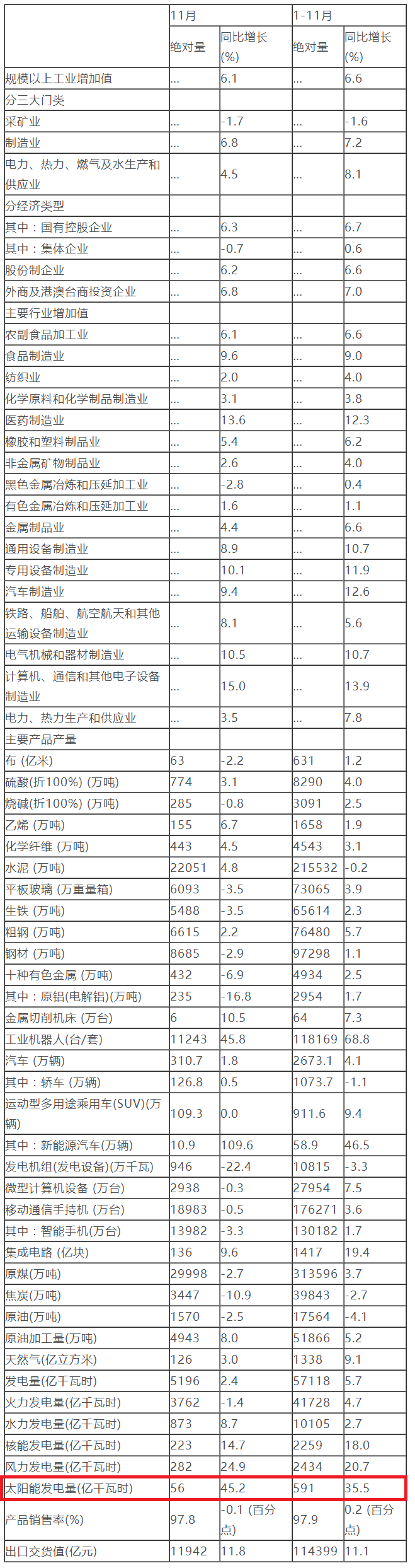 其中,11月,我國太陽能發(fā)電量56億千瓦時,同比增長45.2%。1-11月太陽能發(fā)電量591億千瓦時,同比增長35.5%。