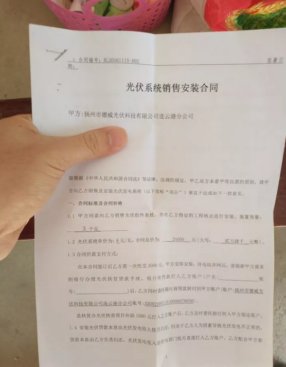 但記者走訪(fǎng)了新安鎮(zhèn)東王村、宋集村多個(gè)已安裝光伏設(shè)備的農(nóng)戶(hù)家中發(fā)現(xiàn),僅有一戶(hù)農(nóng)戶(hù)表示拿到了和揚(yáng)州德威光伏公司的合同,有的農(nóng)戶(hù)僅僅拿到一張3000元的收據(jù)。隨后,記者致電德威光伏灌南分公司負(fù)責(zé)人王超峰,他告訴記者,目前灌南縣已有近400戶(hù)低收入戶(hù)安裝了光伏發(fā)電設(shè)施,有226戶(hù)已并網(wǎng)產(chǎn)生收益。至于有的農(nóng)戶(hù)沒(méi)有合同,他表示是農(nóng)戶(hù)不要,但所有合同公司都有存底。