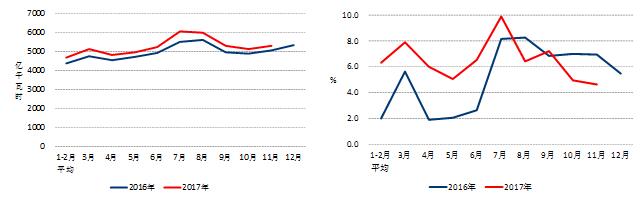 圖1 2016、2017年分月全社會用電量及其增速