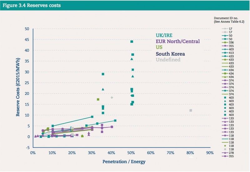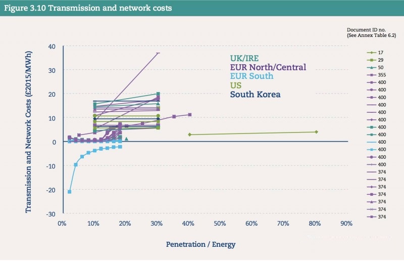第三項(xiàng)要考慮的系統(tǒng)成本因素是因?yàn)槲{間歇性可再生能源電網(wǎng)所需要的“加固”和“靈活性”改造,此項(xiàng)成本約在5-20英鎊/兆瓦時(shí)(合人民幣0.04-0.17元/千瓦時(shí))。越是不靈活的電網(wǎng),改造成本就越高。但是由于電網(wǎng)本身需要不斷的技術(shù)改造,并和周邊地區(qū)或國(guó)家聯(lián)網(wǎng),所以電網(wǎng)改造的成本并不應(yīng)該全部算在可再生能源頭上。