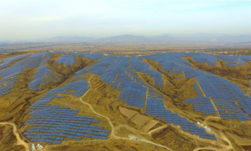 資料圖片:張家口市下花園區(qū)張家莊村荒山上建設(shè)的奧運迎賓光伏廊道項目。新華社記者 王曉 攝