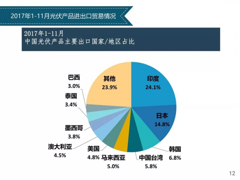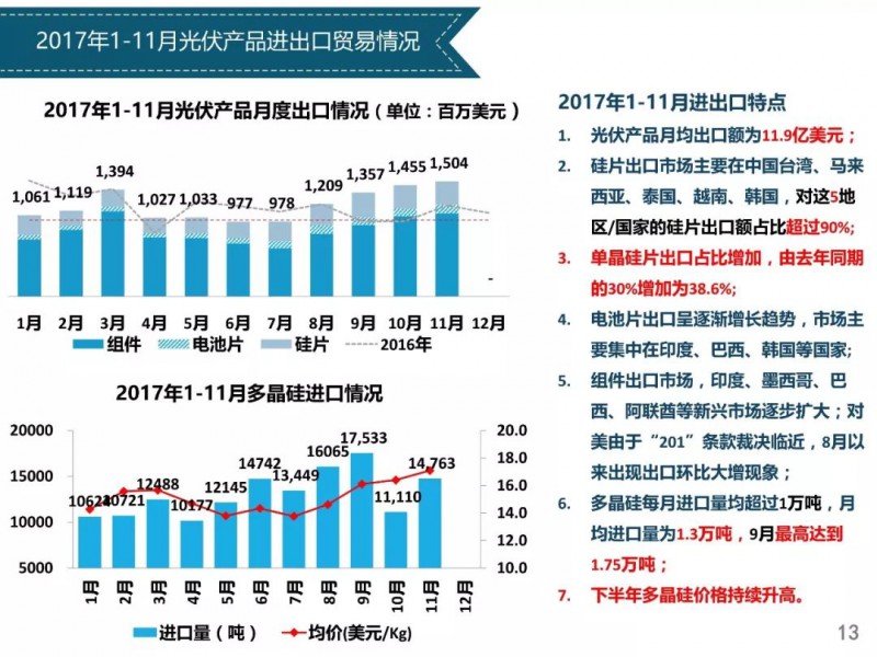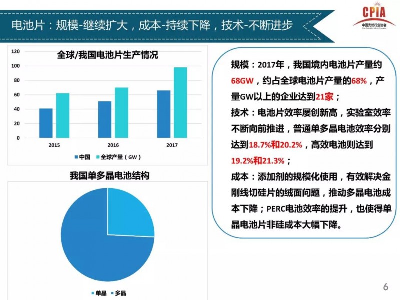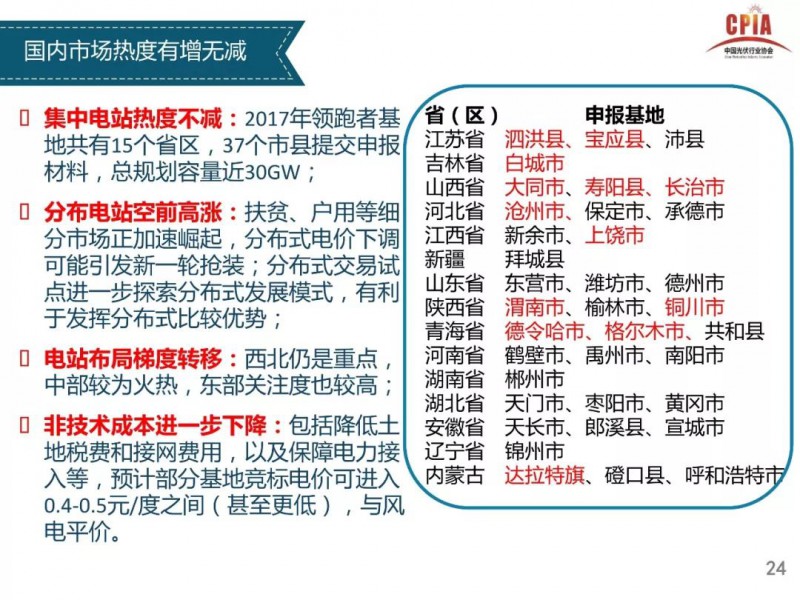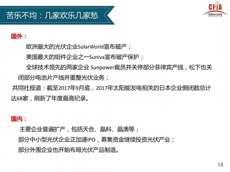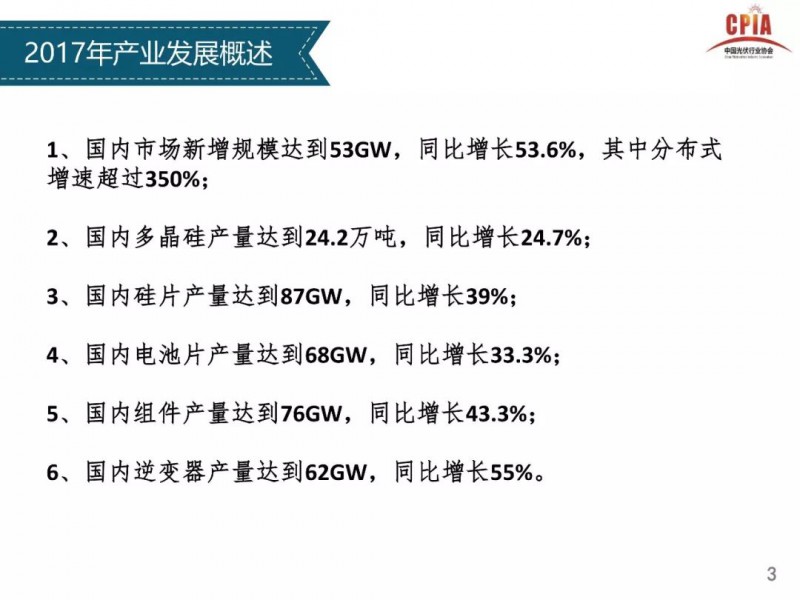 2018年1月24日,中國光伏行業(yè)協(xié)會(huì)主辦的光伏行業(yè)2017年回顧與2018年展望研討會(huì)在京召開。中國光伏行業(yè)協(xié)會(huì)秘書長王勃華總結(jié)了從多晶硅、硅片、電池片、組件、逆變器到下游戶用光伏、分布式光伏、領(lǐng)跑者項(xiàng)目以及集中式光伏的發(fā)展情況,同時(shí)對(duì)2018年的發(fā)展前景進(jìn)行了預(yù)測(cè)。