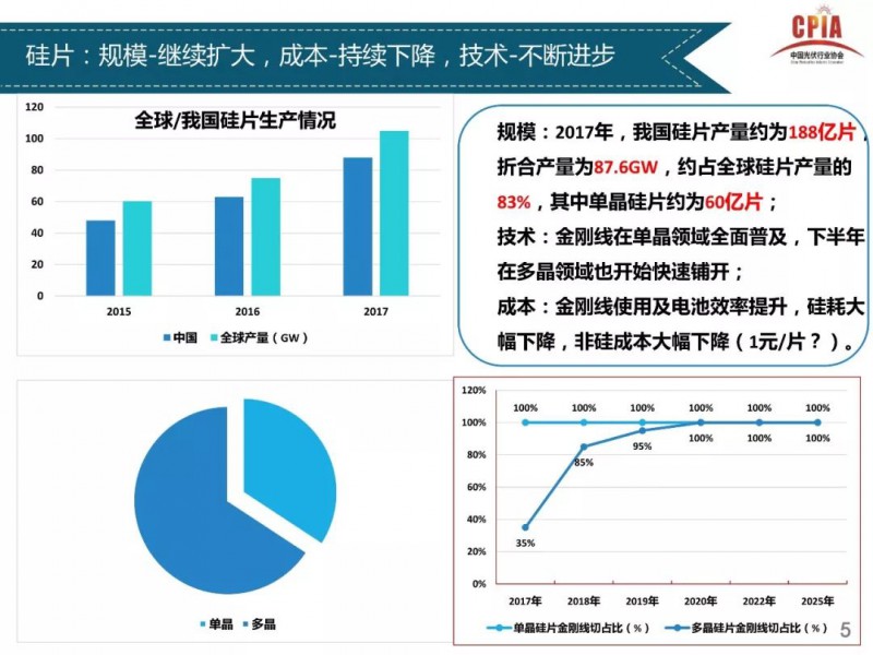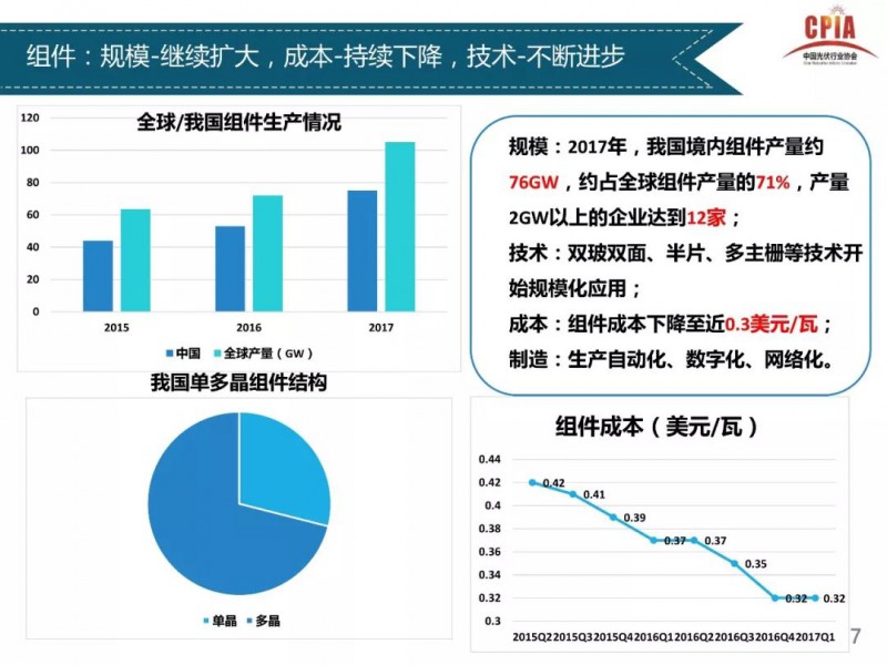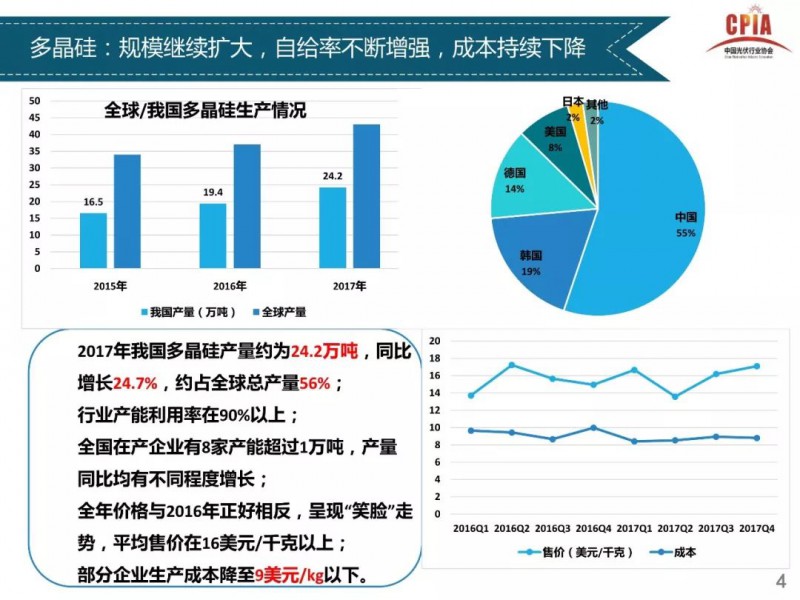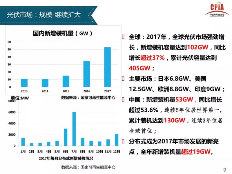 2018年1月24日,中國光伏行業(yè)協(xié)會(huì)主辦的光伏行業(yè)2017年回顧與2018年展望研討會(huì)在京召開。中國光伏行業(yè)協(xié)會(huì)秘書長王勃華總結(jié)了從多晶硅、硅片、電池片、組件、逆變器到下游戶用光伏、分布式光伏、領(lǐng)跑者項(xiàng)目以及集中式光伏的發(fā)展情況,同時(shí)對(duì)2018年的發(fā)展前景進(jìn)行了預(yù)測(cè)。中國光伏行業(yè)協(xié)會(huì) 副理事長兼秘書長2017年全年行業(yè)
